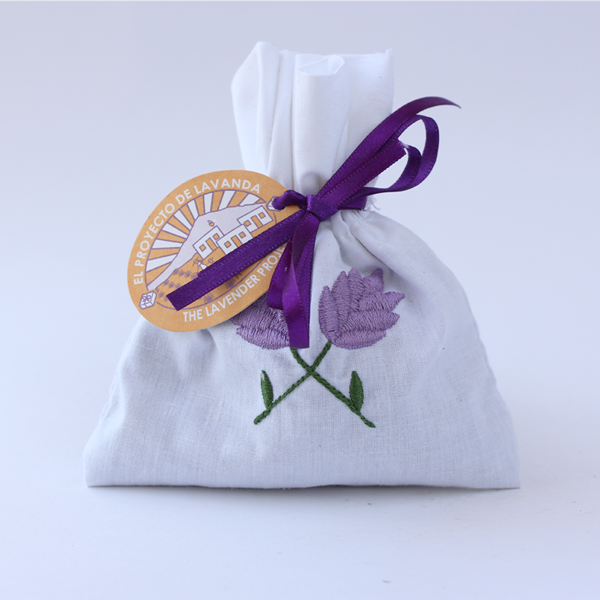 Hechos de manta (100% algodón), bordados a mano con hilos de algodón y rellenos con flor de lavanda cuyo aroma promueve la relajación.